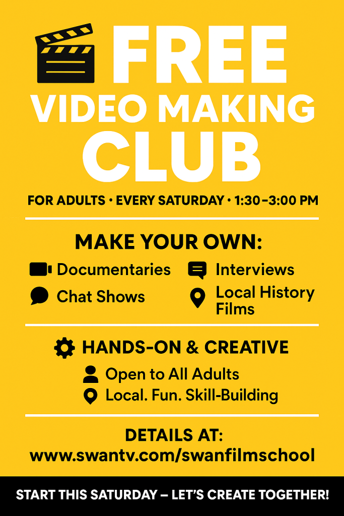 Every Saturday from 1.30 to 3pm (during school vacations 1.00 to 2.30pm) there is an adult film making group meeting to learn the art of video making through a sociable practical guidance. It’s free, so come along. Let us know you are coming by text or whatsapping 07964 827959. We look forward to meeting you.